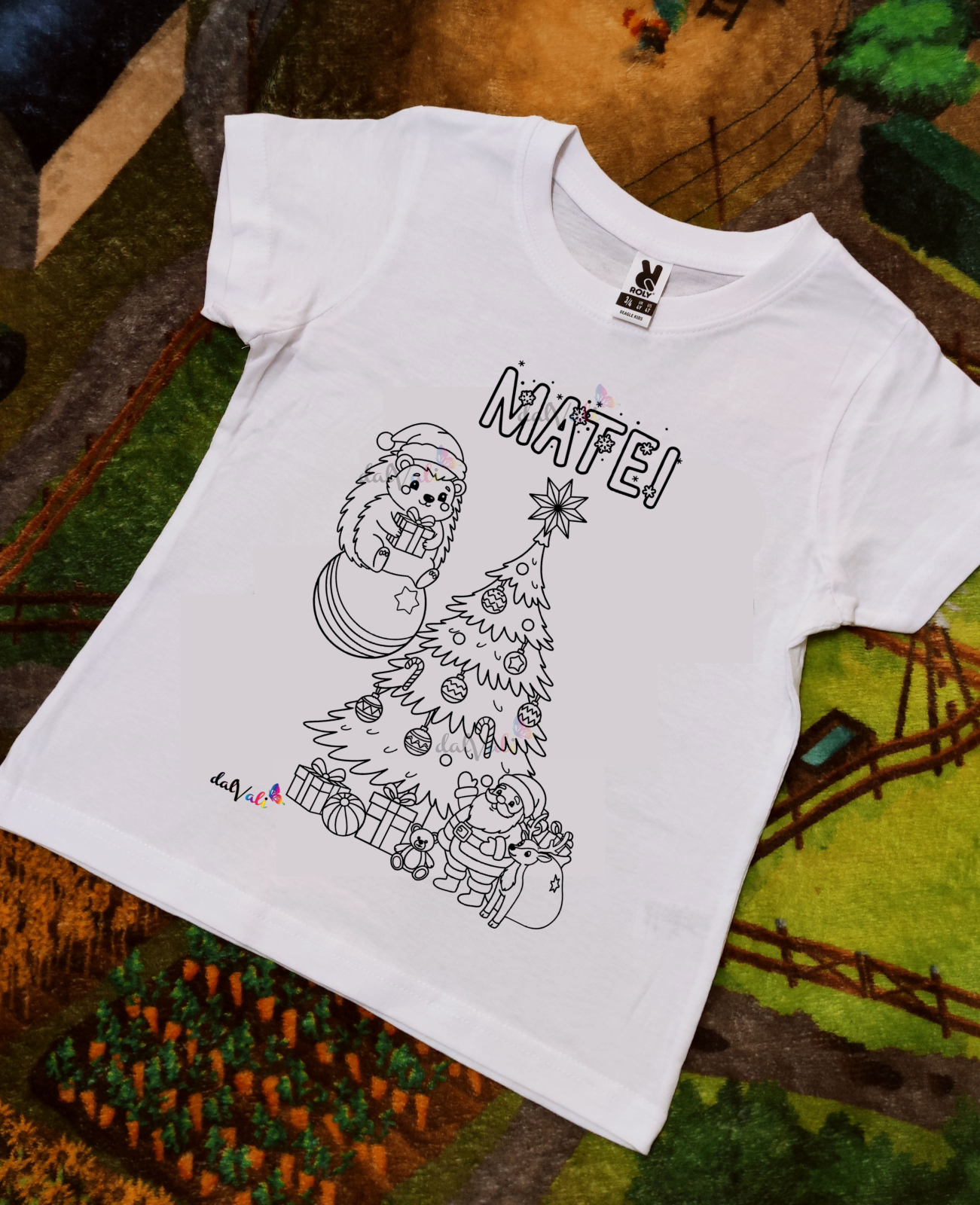 Tricoul de colorat poate fi personalizat GRATUIT cu numele copilasului deasupra imaginii si denumire clasa/ scurt text sub imagine (Saptamana Altfel/CRACIUN FERICIT/HO!HO!HO!/CLASA ARICILOR etc) sau se poate imprima doar imaginea.