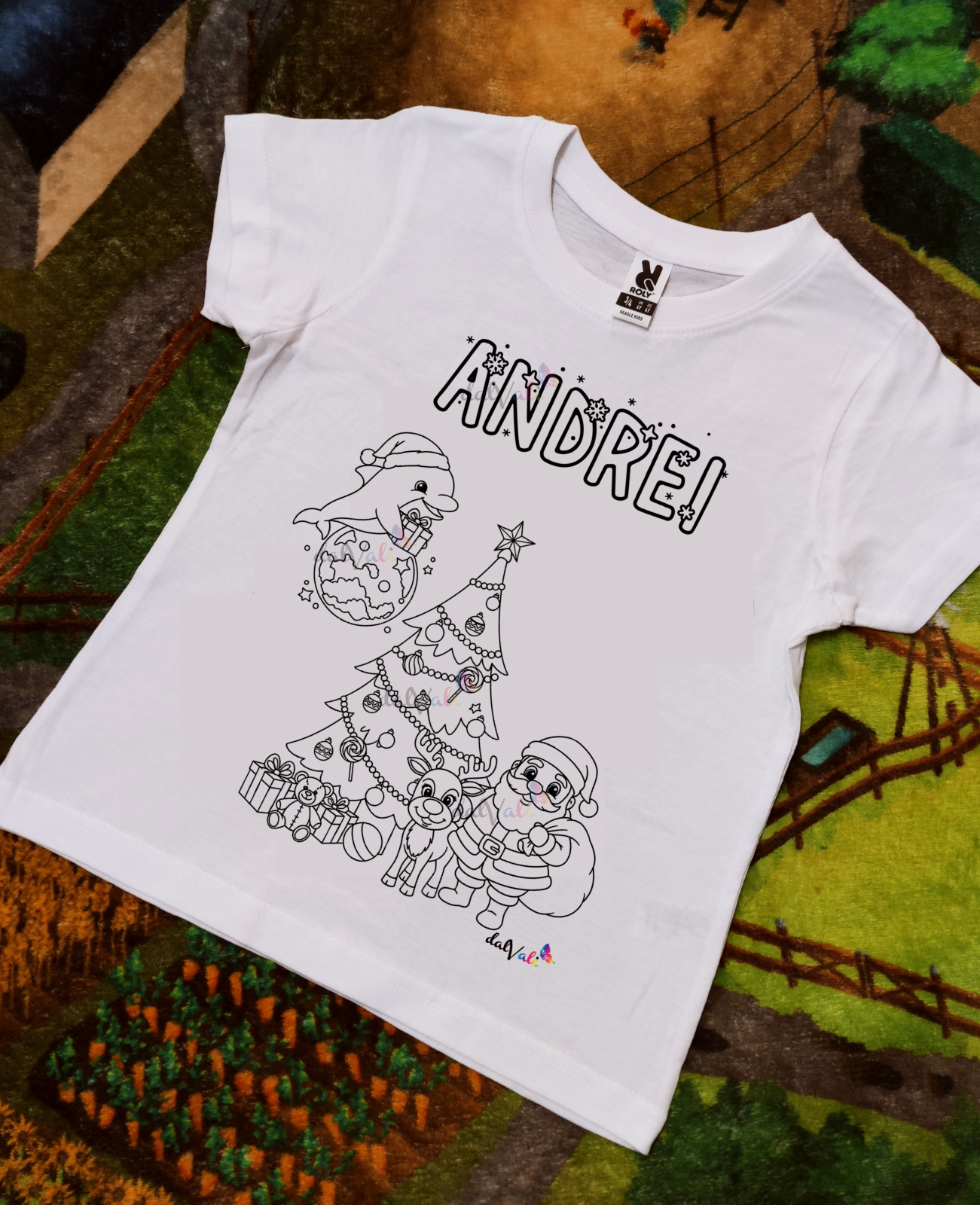 Tricou educativ de colorat Mos Craciun - Delfinas langa Brad