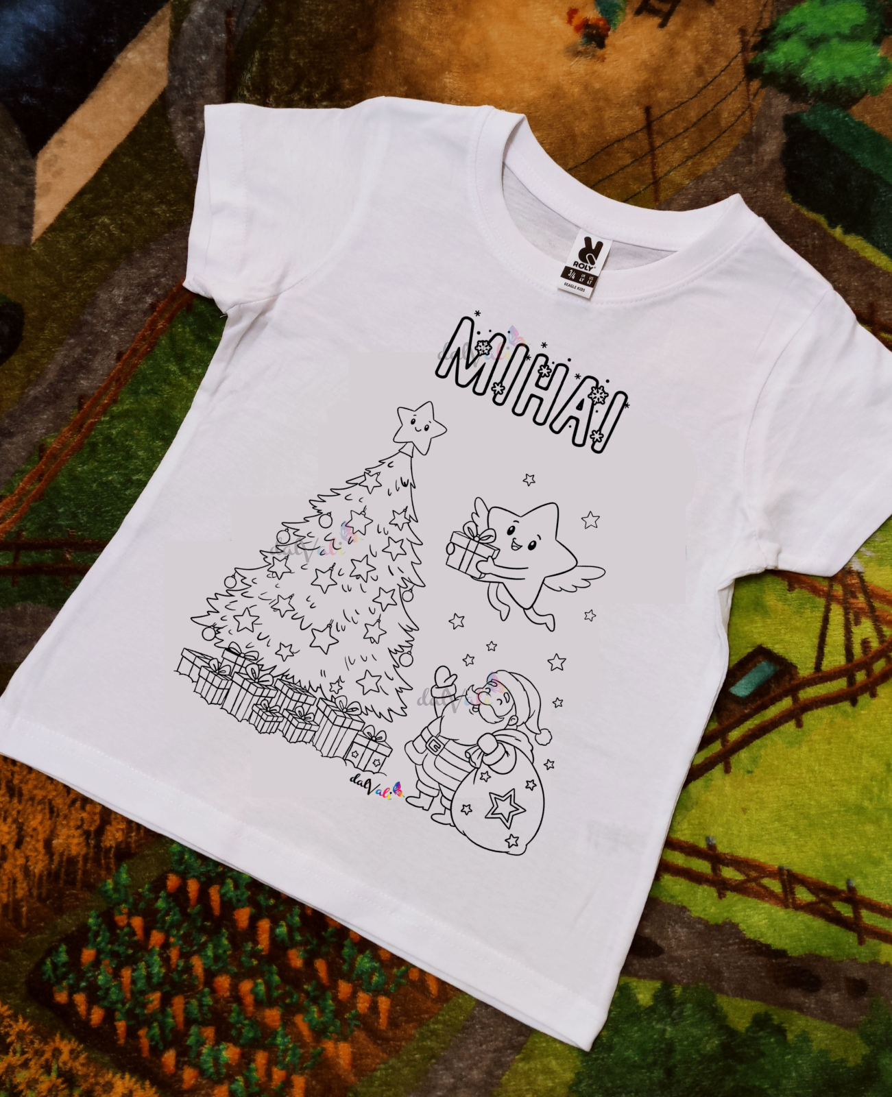 Tricoul de colorat poate fi personalizat GRATUIT cu numele copilasului deasupra imaginii si denumire clasa/ scurt text sub imagine (Saptamana Altfel/CRACIUN FERICIT/HO!HO!HO!/CLASA STELUTELOR etc) sau se poate imprima doar imaginea.